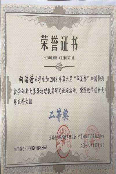 360足球直播吧 共有4名同学参加比赛并取得了优异成绩,其中本科生2名,研究生2名,向洁茜获得教学创新大赛本科生组二等奖、王南婷获得二等奖,旷紫薇获得教学创新大赛研究生组二等奖、王璇获得三等奖,我校荣获优秀组织奖,此次带队老师为360足球直播吧 物理系唐京武老师。