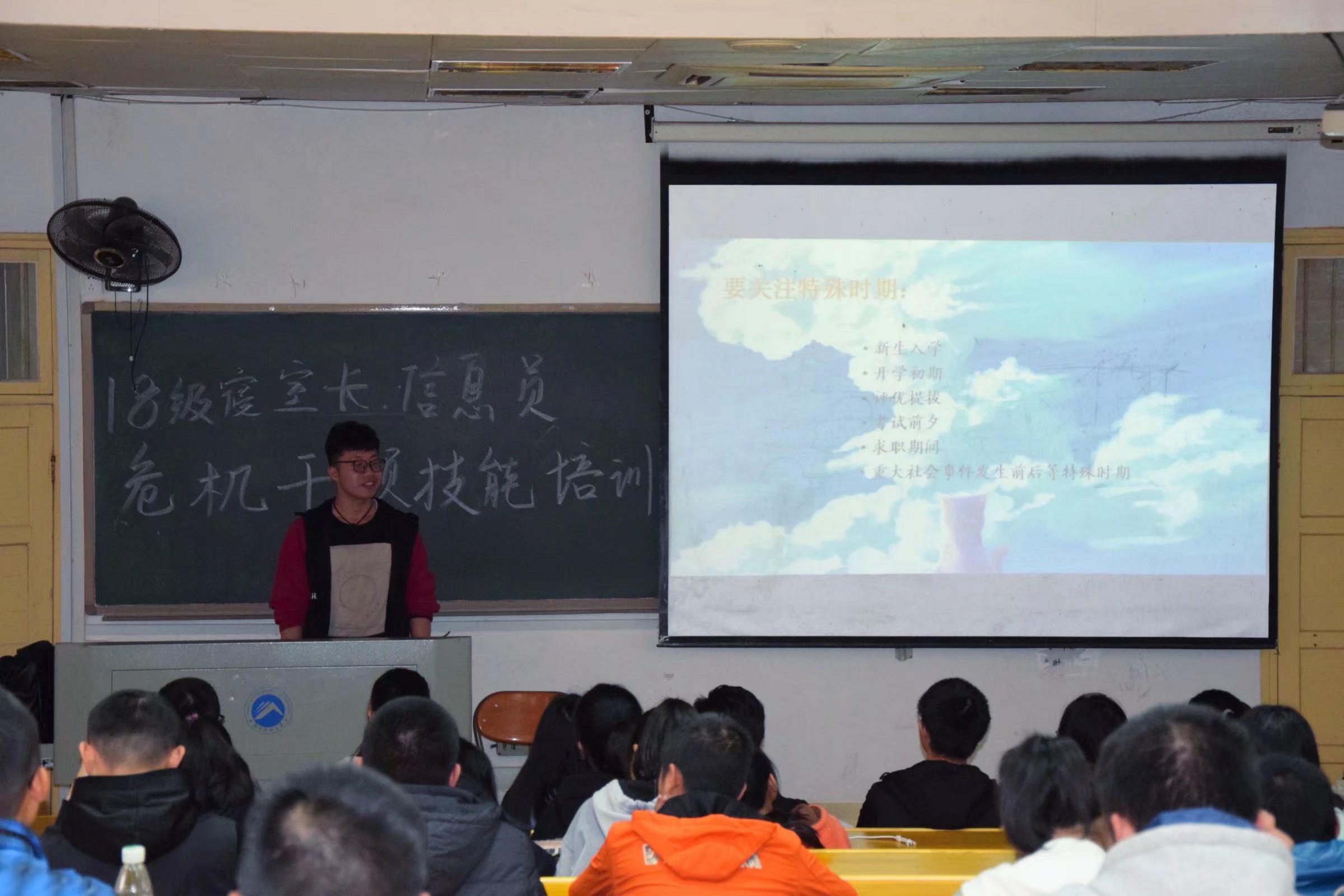 为了增强寝室长、信息员的心理健康意识,提高危机干预技能。360足球直播吧 于11月23日星期五下午4:00在十教东附楼103举办了2018级寝室长、信息员危机干预技能培训大会。360足球直播吧 2018级各寝室长与团支书以及受邀前来的生命科学足球吧 团委学生会心健部部长、副部长参与了本次培训大会。本次培训大会由360足球直播吧 心健部副部长王明涛主持。