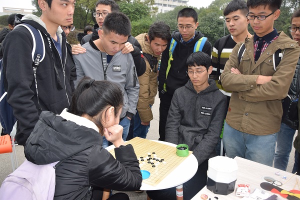 栩栩如生的海报,五颜六色的气球,精彩纷呈的活动把男女老少的视线都吸引了过来,就连93岁高龄的老爷爷都忍不住驻足询问。在棋艺的竞技场上,既有低头沉思的围棋高手,又有冥思苦想的象棋新手,同学们在小小的棋子中,感受到了中华文化的博大精深,也通过这个活动认识了许多棋场上的好友。在一旁的“小环投篮”中,同学们各出奇招,手脚并用,现场时不时响起热烈的掌声,为对手鼓掌,也为自己鼓掌。小小的投篮游戏对同学们的眼力、灵活性的考验可不小,大家都感慨要加强锻炼。另一边安静的小角落,是认真写下自己的偶像的小粉丝们,通过“偶像万万岁”这个活动激励大家向偶像学习,走的更远。临近上课,我们的活动也接近尾声,但是现场的欢声笑语却伴着同学们带到了校园的每一处。