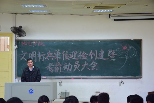 于十教附一202召开文明标兵单位迎检创建暨考前动员大会。院党委书记周文革、副书记邓辉及学工办吴秋霜老师出席此次会议。参加会议的还有院团委学生会各级干部和足球吧
