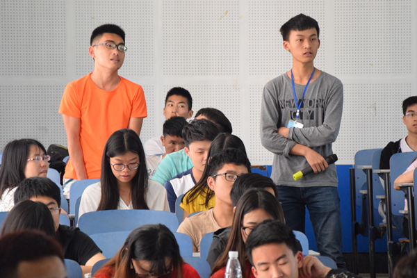 在主持人致辞并介绍现场来宾后,交流会正式开始。首先上台作经验交流的是考入中南大学的周慧敏同学,她细心地讲解了专业课的系统性复习方法,希望同学们能够在考研路上坚持下去,最终圆梦。第二位介绍经验的常宇佳同学,以英语82分的高分考入湖南大学,她以幽默的口吻,结合自身经历针对考研英语题目练习以及考试注意事项作详细介绍,强调了上课听讲的重要性,她的实事求是、严谨踏实的态度给同学们留下深刻印象。考入南京大学的“学神”李俊,他用“耐得寂寞,坚持到底”诠释了自己444分的由来,并就政治复习作详细介绍,希望同学们在考研复习上能够科学计划、严格执行。在这三位优秀的同学讲述结束后,活动进入了提问环节,现场大一至大三的同学提出了有关做题方法及技巧等方面的问题,几位学长学姐对他们的问题进行了耐心的解答并给出建议,帮助他们解决心中的疑虑。现场提问后,另外两位优秀的同学继续就复习方法进行讲解。考入华南理工大学的杜诗敏同学用谦谨而又简洁的语言阐述了自己数学的复习经历,强调了“会做的全做对”的重要性。考入中山大学的丁理同学,也细致地向同学们讲述了自己如何渐至佳境的过程以及如何通过高效学习,达到事半功倍的效果,他还悉心总结了考前准备技巧。他们两位的讲解在同学们心中产生共鸣,赢得阵阵掌声。最后,主持人宣布活动圆满结束,同学们满载而归。