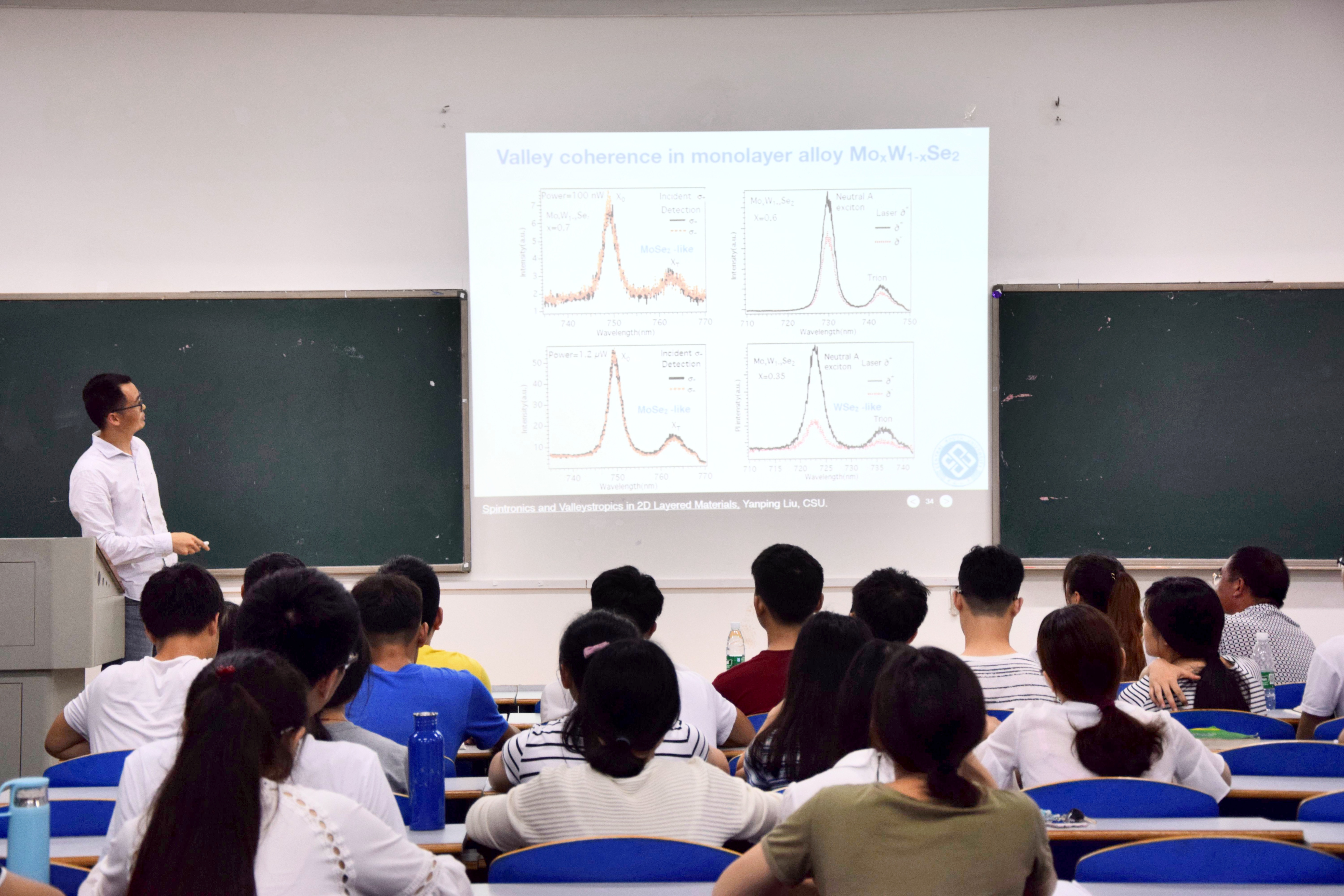 讲学开始,刘教授展示了基于二维层状材料自旋电子学和谷电子学的研究,他用精准与专业的知识让同学们看到了科学前沿领域的发展。紧接着,杨兵初教授向大家介绍了中南大学物理与电子足球吧