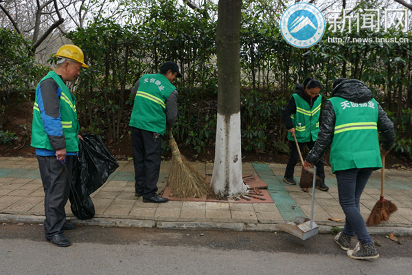 在本次活动中,天创物业公司项目部出动72名员工,加上四个社团的志愿者,共有150多人参与其中。下午三点整,志愿者们穿着红、蓝马甲,在寒风中整齐地排着长队,于八区五食堂门口集合。他们被分成三组队伍行动,分别负责清理北校家属区卫生,樱花园落叶和校园主干道的白色垃圾。